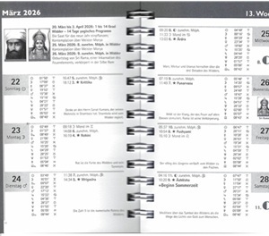 Die astrologischen Daten in diesem Kalender entsprechen der UTC-Zeit +1 (Koordinierte Weltzeit +1) und der Sommerzeit (Koordinierte Weltzeit +2). Die Spiralbindung macht ihn sehr benutzerfreundlich; auf den Seiten zur Wochen-Ansicht gibt es genügend Platz für Einträge. Hier die Ansicht einer Seite: